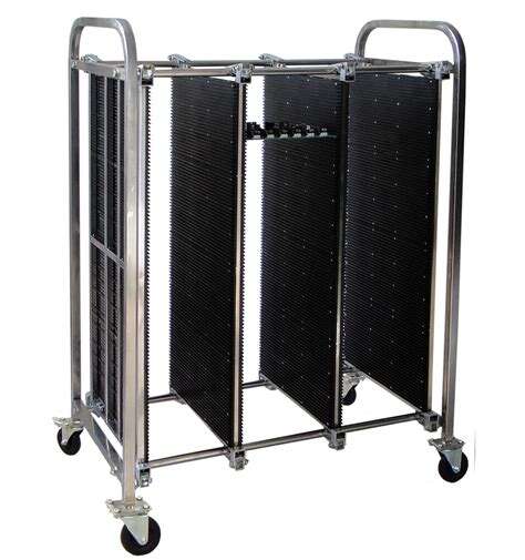 Stainless steel, conductive plastic panel ESD castor with brake Compartment width are easy adjustable by buckle Quantity (capacity) of panels are optional Side guide slot: depth 3.5mm, width 5mm, pitch 10mm Surface resistance: 104~106 Ω Length could be customer made